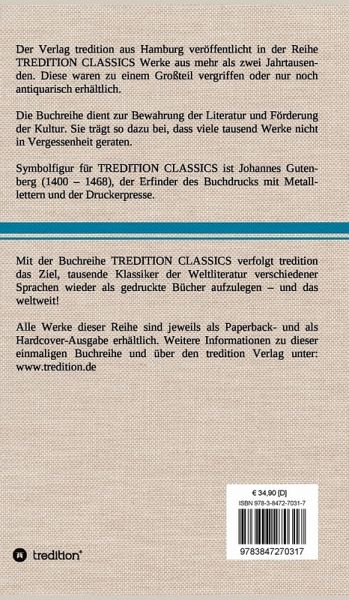 Diese Hardcover-Ausgabe ist Teil der TREDITION CLASSICS. Der Verlag tredition aus Hamburg veröffentlicht in der Buchreihe TREDITION CLASSICS Werke aus mehr als zwei Jahrtausenden. Diese waren zu einem Großteil vergriffen oder nur noch antiquarisch erhältlich. Mit TREDITION CLASSICS verfolgt tredition das Ziel, tausende Klassiker der Weltliteratur verschiedener Sprachen wieder als gedruckte Bücher zu verlegen und das weltweit! Die Buchreihe dient zur Bewahrung der Literatur und Förderung der Kultur. Sie trägt so dazu bei, dass viele tausend Werke nicht in Vergessenheit geraten.