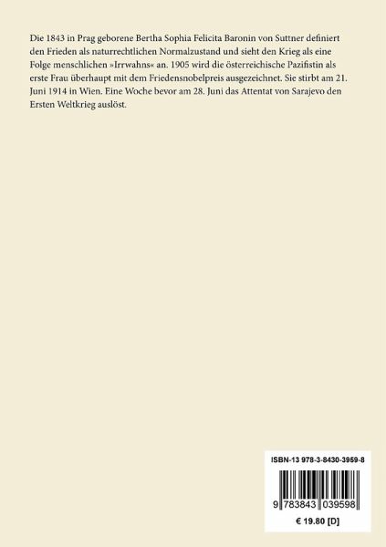 Bertha von Suttner: Die Waffen nieder! Eine Lebensgeschichte Erstdruck: Dresden (Edgar Pierson) 1889. Vollständige Neuausgabe mit einer Biographie der Autorin. Herausgegeben von Karl-Maria Guth. Berlin 2015. Textgrundlage sind die Ausgaben: Bertha von Suttner: Die Waffen nieder! Eine Lebensgeschichte. 4. Tsd., 2 Bände, Band 1, Dresden und Leipzig: E. Pierson¿s Verlag, 1892. Bertha von Suttner: Die Waffen nieder! Eine Lebensgeschichte. 4. Tsd., 2 Bände, Band 2, Dresden und Leipzig: E. Pierson¿s Verlag, 1892. Die Paginierung obiger Ausgaben wird in dieser Neuausgabe als Marginalie zeilengenau mitgeführt. Umschlaggestaltung von Thomas Schultz-Overhage unter Verwendung des Bildes: Edouard Detaille, Le Rêve, 1888. Gesetzt aus Minion Pro, 11 pt. Über die Autorin: Die 1843 in Prag geborene Bertha Sophia Felicita Baronin von Suttner definiert den Frieden als naturrechtlichen Normalzustand und sieht den Krieg als eine Folge menschlichen »Irrwahns« an. 1905 wird die österreichische Pazifistin als erste Frau überhaupt mit dem Friedensnobelpreis ausgezeichnet. Sie stirbt am 21. Juni 1914 in Wien. Eine Woche bevor am 28. Juni das Attentat von Sarajevo den Ersten Weltkrieg auslöst.
