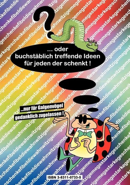 Humorvolle Geschenkideen von A-Z für jeden Geschmack, jede Gelegenheit, jeden Geldbeutel und jedermann/frau. Für den Leser selbst sind witzige Eigeninterpretationen eingebaut um die Langeweile beim Schmökern in Grenzen zu halten und um die Lachmuskeln zu aktivieren...