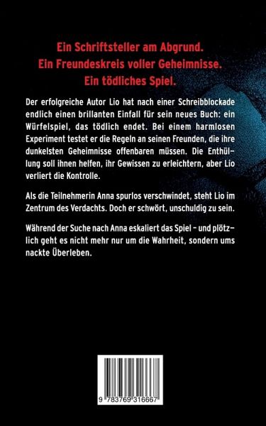 Ein Schriftsteller am Abgrund. Ein Freundeskreis voller Geheimnisse. Ein tödliches Spiel. Der erfolgreiche Autor Lio hat nach einer Schreibblockade endlich einen brillanten Einfall für sein neues Buch: ein Würfelspiel, das tödlich endet. Bei einem harmlosen Experiment testet er die Regeln an seinen Freunden, die ihre dunkelsten Geheimnisse offenbaren müssen. Die Enthüllung soll ihnen helfen, ihr Gewissen zu erleichtern, aber Lio verliert die Kontrolle. Als die Teilnehmerin Anna spurlos verschwindet, steht Lio im Zentrum des Verdachts. Doch er schwört, unschuldig zu sein. Während der Suche nach Anna eskaliert das Spiel - und plötzlich geht es nicht mehr nur um die Wahrheit, sondern ums nackte Überleben.