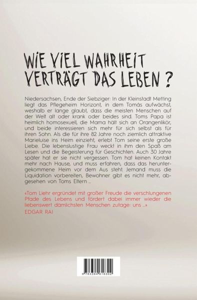 Wie viel Wahrheit verträgt das Leben?Niedersachsen, Ende der Siebziger: In der Kleinstadt Metting liegt das Pflegeheim Horizont, in dem Tomás aufwächst, weshalb er lange glaubt, dass die meisten Menschen auf der Welt alt oder krank oder beides sind. Toms Papa ist heimlich homosexuell, die Mama hält sich an Orangenlikör, und beide interessieren sich mehr für sich selbst als für ihren Sohn. Als die für ihre 82 Jahre noch ziemlich attraktive Marieluise ins Heim einzieht, erlebt Tom seine erste große Liebe. Die lebenslustige Frau weckt in ihm den Spaß am Lesen und die Begeisterung für Geschichten.…mehr