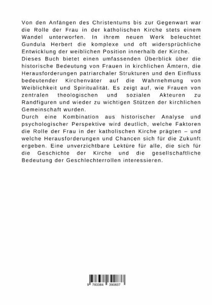 Von den Anfängen des Christentums bis zur Gegenwart war die Rolle der Frau in der katholischen Kirche stets einem Wandel unterworfen. In ihrem neuen Werk beleuchtet Gundula Herbert die komplexe und oft widersprüchliche Entwicklung der weiblichen Position innerhalb der Kirche.Dieses Buch bietet einen umfassenden Überblick über die historische Bedeutung von Frauen in kirchlichen Ämtern, die Herausforderungen patriarchaler Strukturen und den Einfluss bedeutender Kirchenväter auf die Wahrnehmung von Weiblichkeit und Spiritualität. Es zeigt auf, wie Frauen von zentralen theologischen und sozialen Akteuren zu Randfiguren und wieder zu wichtigen Stützen der kirchlichen Gemeinschaft wurden.Durch eine Kombination aus historischer Analyse und psychologischer Perspektive wird deutlich, welche Faktoren die Rolle der Frau in der katholischen Kirche prägten - und welche Herausforderungen und Chancen sich für die Zukunft ergeben. Eine unverzichtbare Lektüre für alle, die sich für die Geschichteder Kirche und die gesellschaftliche Bedeutung der Geschlechterrollen interessieren.