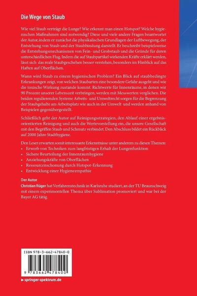 Wieviel Staub verträgt die Lunge? Wie erkennt man einen Hotspot? Welche hygienischen Maßnahmen sind notwendig? Diese und viele andere Fragen beantwortet der Autor, indem er zunächst die physikalischen Grundlagen der Luftbewegung, der Entstehung von Staub und der Staubbindung darstellt. Er beschreibt beispielsweise die Entstehungsmechanismen von Fein- und Grobstaub und die Gründe für deren unterschiedlichen Flug. Die Einbeziehung der auf die Staubpartikel wirkenden Kräfte verschafft Durchblick über das reale Staubgeschehen, besonders im Hinblick auf das Haften auf Oberflächen.