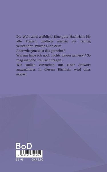Die Welt wird weiblich! Eine gute Nachricht für alle Frauen. Endlich werden sie richtig verstanden. Wurde auch Zeit!Aber wie genau ist das gemeint?Warum habe ich noch nichts davon gemerkt? So mag manche Frau sich fragen.Wir wollen versuchen uns einer Antwort anzunähern. In diesem Büchlein wird alles erklärt.