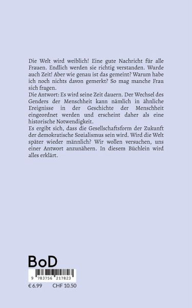 Die Welt wird weiblich! Eine gute Nachricht für alle Frauen. Endlich werden sie richtig verstanden. Wurde auch Zeit! Aber wie genau ist das gemeint? Warum habe ich noch nichts davon gemerkt? So mag manche Frau sich fragen. Die Antwort: Es wird seine Zeit dauern. Der Wechsel des Genders der Menschheit kann nämlich in ähnliche Ereignisse in der Geschichte der Menschheit eingeordnet werden und erscheint daher als eine historische Notwendigkeit.Es ergibt sich, dass die Gesellschaftsform der Zukunft der demokratische Sozialismus sein wird. Wird die Welt später wieder männlich? Wir wollen versuchen, uns einer Antwort anzunähern. In diesem Büchlein wird alles erklärt.
