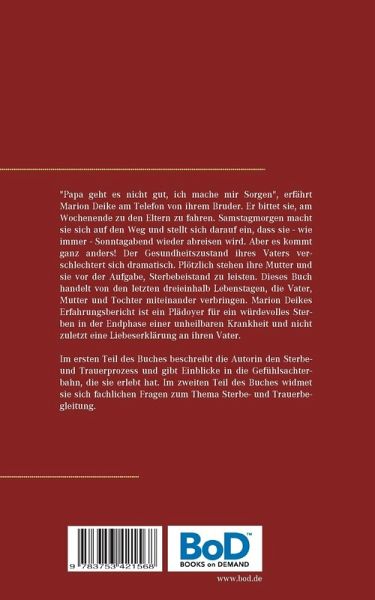 "Papa geht es nicht gut, ich mache mir Sorgen", erfährt Marion Deike am Telefon von ihrem Bruder. Er bittet sie, am Wochenende zu den Eltern zu fahren. Samstagmorgen macht sie sich auf den Weg und stellt sich darauf ein, dass sie - wie immer - Sonntagabend wieder abreisen wird. Aber es kommt ganz anders! Der Gesundheitszustand ihres Vaters verschlechtert sich dramatisch. Plötzlich stehen ihre Mutter und sie vor der Aufgabe, Sterbebeistand zu leisten. Dieses Buch handelt von den letzten dreieinhalb Lebenstagen, die Vater, Mutter und Tochter miteinander verbringen. Marion Deikes Erfahrungsbericht ist ein Plädoyer für ein würdevolles Sterben in der Endphase einer unheilbaren Krankheit und nicht zuletzt eine Liebeserklärung an ihren Vater. Im ersten Teil des Buches beschreibt die Autorin den Sterbe- und Trauerprozess und gibt Einblicke in die Gefühlsachterbahn, die sie erlebt hat. Im zweiten Teil des Buches widmet sie sich fachlichen Fragen zum Thema Sterbe- und Trauerbegleitung.
