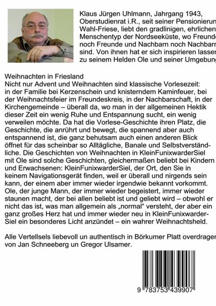 Weihnachtsgeschichten aus FrieslandAdvent und Weihnachten sind die klassische Vorlesezeit in der Familie bei Kerzenschein und knisterndem Kaminfeuer, bei der Weihnachtsfeier im Freundeskreis, in der Nachbarschaft, in der Kirchengemeinde, eben überall da, wo man in der allgemeinen Hektik dieser Zeit ein wenig Ruhe und Entspannung sucht, ein wenig verweilen möchte. Da hat die Vorlesegeschichte ihren Platz, die Geschichte, die anrührt und bewegt, die spannend aber auch entspannend ist, die ganz behutsam auch einen anderen Blick öffnet für das scheinbar so Alltägliche, Banale und Selbstverständliche. Die Geschichten von Weihnachten in KleinFunixwarderSiel mit Ole sind solche Geschichten, gleichermaßen beliebt bei Kindern und Erwachsenen. KleinFunixwarderSiel, der Ort, den Sie in keinem Navigationsgerät finden, weil er überall und nirgends sein kann, der einem aber immer wieder irgendwie bekannt vorkommt. Ole, der junge Mann, der immer wieder begeistert, immer wieder staunen macht, der bei allen beliebt ist und geliebt wird, obwohl er nicht das ist, was man allgemein als normal versteht, der aber ein ganz großes Herz hat und immer wieder neu in KleinFunixwarderSiel ein besonderes Licht anzündet, ein wahrer Weihnachtsheld.Alle Vertellsels liebevoll un authentisch in Börkumer Platt overdragen von Jan Schneeberg un Gregor Ulsamer.