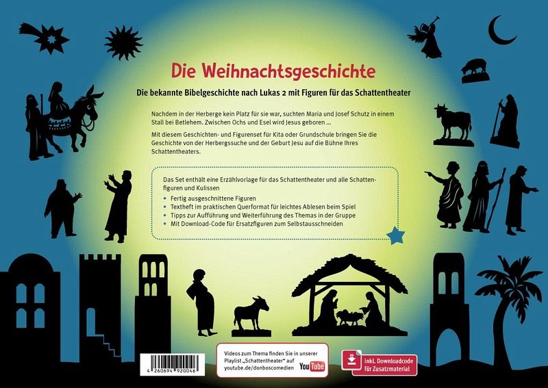 Die Weihnachtsgeschichte aus der Bibel zählt zu den wichtigsten und bekanntesten christlichen Erzählungen. Mit den Figuren für das Schattentheater erhält Jesus' Geburt eine Bühne, die Kinder in Kindergarten und Grundschule zum Staunen bringt.