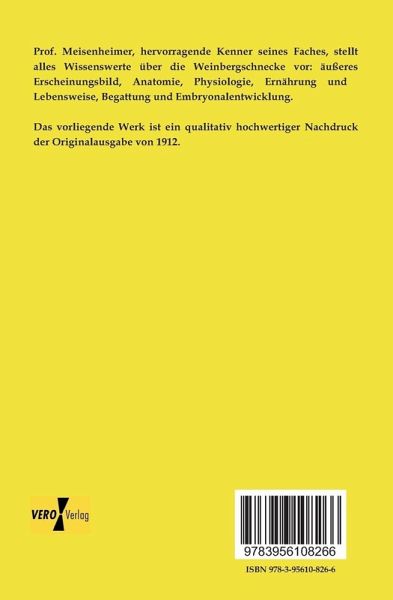 Prof. Meisenheimer, hervorragende Kenner seines Faches, stellt alles Wissenswerte über die Weinbergschnecke vor: äußeres Erscheinungsbild, Anatomie, Physiologie, Ernährung und Lebensweise, Begattung und Embryonalentwicklung.