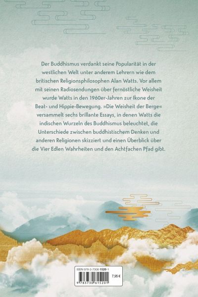 Der Buddhismus verdankt seine Popularität in der westlichen Welt unter anderem Lehrern wie dem britischen Religionsphilosophen Alan Watts. Vor allem mit seinen Radiosendungen über fernöstliche Weisheit wurde Watts in den 1960er-Jahren zur Ikone der Beat- und Hippie-Bewegung. »Die Weisheit der Berge« versammelt sechs brillante Essays, in denen Watts die indischen Wurzeln des Buddhismus beleuchtet, die Unterschiede zwischen buddhistischem Denken und anderen Religionen skizziert und einen Überblick über die Vier Edlen Wahrheiten und den Achtfachen Pfad gibt.