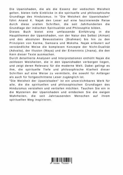 Die Upanishaden, die als die Essenz der vedischen Weisheit gelten, bieten tiefe Einblicke in die spirituelle und philosophische Grundlage des Hinduismus. In "Die Weisheit der Upanishaden" führt Anand K. Najak den Leser auf eine faszinierende Reise durch diese uralten Schriften, die seit Jahrhunderten die Grundlage der indischen Spiritualität und Philosophie bilden.Dieses Buch bietet eine umfassende Einführung in die Hauptthemen der Upanishaden, von der Natur des Selbst (Atman) und des absoluten Bewusstseins (Brahman) bis hin zu den Prinzipien von Karma, Samsara und Moksha. Najak erläutert auf verständliche Weise die komplexen Konzepte der Nicht-Dualität (Advaita), der Illusion (Maya) und der Erkenntnis (Jnana), die den Kern dieser Texte ausmachen.Durch detaillierte Analysen und Interpretationen enthüllt Najak die zeitlosen Weisheiten, die in den Upanishaden verborgen liegen, und zeigt deren Relevanz für die moderne Welt. Dabei gelingt es ihm, die spirituelle Tiefe und philosophische Klarheit dieser Schriften auf eine Weise zu vermitteln, die sowohl für Anfänger als auch für fortgeschrittene Leser zugänglich ist."Die Weisheit der Upanishaden" ist ein unverzichtbares Werk für alle, die die spirituellen und philosophischen Grundlagen des Hinduismus verstehen und vertiefen möchten. Tauchen Sie ein in die Mysterien der Upanishaden und entdecken Sie die ewigen Wahrheiten, die seit Jahrtausenden Menschen auf ihrem spirituellen Weg inspirieren.