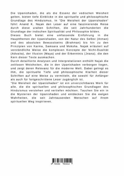 Die Upanishaden, die als die Essenz der vedischen Weisheit gelten, bieten tiefe Einblicke in die spirituelle und philosophische Grundlage des Hinduismus. In "Die Weisheit der Upanishaden" führt Anand K. Najak den Leser auf eine faszinierende Reise durch diese uralten Schriften, die seit Jahrhunderten die Grundlage der indischen Spiritualität und Philosophie bilden.Dieses Buch bietet eine umfassende Einführung in die Hauptthemen der Upanishaden, von der Natur des Selbst (Atman) und des absoluten Bewusstseins (Brahman) bis hin zu den Prinzipien von Karma, Samsara und Moksha. Najak erläutert auf verständliche Weise die komplexen Konzepte der Nicht-Dualität (Advaita), der Illusion (Maya) und der Erkenntnis (Jnana), die den Kern dieser Texte ausmachen.Durch detaillierte Analysen und Interpretationen enthüllt Najak die zeitlosen Weisheiten, die in den Upanishaden verborgen liegen, und zeigt deren Relevanz für die moderne Welt. Dabei gelingt es ihm, die spirituelle Tiefe und philosophische Klarheit dieser Schriften auf eine Weise zu vermitteln, die sowohl für Anfänger als auch für fortgeschrittene Leser zugänglich ist."Die Weisheit der Upanishaden" ist ein unverzichtbares Werk für alle, die die spirituellen und philosophischen Grundlagen des Hinduismus verstehen und vertiefen möchten. Tauchen Sie ein in die Mysterien der Upanishaden und entdecken Sie die ewigen Wahrheiten, die seit Jahrtausenden Menschen auf ihrem spirituellen Weg inspirieren.