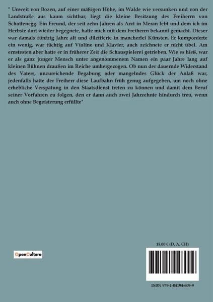" Unweit von Bozen, auf einer mäßigen Höhe, im Walde wie versunken und von der Landstraße aus kaum sichtbar, liegt die kleine Besitzung des Freiherrn von Schottenegg. Ein Freund, der seit zehn Jahren als Arzt in Meran lebt und dem ich im Herbste dort wieder begegnete, hatte mich mit dem Freiherrn bekannt gemacht. Dieser war damals fünfzig Jahre alt und dilettierte in mancherlei Künsten. Er komponierte ein wenig, war tüchtig auf Violine und Klavier, auch zeichnete er nicht übel. Am ernstesten aber hatte er in früherer Zeit die Schauspielerei getrieben. Wie es hieß, war er als ganz junger Mensch unter angenommenem Namen ein paar Jahre lang auf kleinen Bühnen draußen im Reiche umhergezogen. Ob nun der dauernde Widerstand des Vaters, unzureichende Begabung oder mangelndes Glück der Anlaß war, jedenfalls hatte der Freiherr diese Laufbahn früh genug aufgegeben, um noch ohne erhebliche Verspätung in den Staatsdienst treten zu können und damit dem Beruf seiner Vorfahren zu folgen, den er dann auch zwei Jahrzehnte hindurch treu, wenn auch ohne Begeisterung erfüllte"