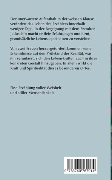 Der unerwartete Aufenthalt in der weissen Klause verändert das Leben des Erzählers innerhalb weniger Tage. In der Begegnung mit dem Eremiten Jeduschin macht er tiefe Erfahrungen und lernt, grundsätzliche Lebensaspekte neu zu verstehen.Von zwei Frauen herausgefordert kommen seine Erkenntnisse auf den Prüfstand der Realität, was ihn veranlasst, sich den Lebenskräften auch in ihrer konkreten Gestalt hinzugeben. In allem wirkt die Kraft und Spiritualität dieses besonderen Ortes.Eine Erzählung voller Weisheit und stiller Menschlichkeit.