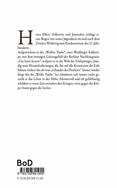 Heino Elfert, Volkswirt und Journalist, schlägt einen Bogen von seiner Jugendzeit im und nach dem Zweiten Weltkrieg zum Pandemonium des 21. Jahrhunderts.Aufgewachsen in der "Weißen Taube", einer Weddinger Eckkneipe, mit dem trotzigen Lebensgefühl der Berliner Nachkriegszeit: "Uns kann keener", stolpert er in die Welt der Schlipsträger. Ständig neue Herausforderungen, die ihn auf alle Kontinente der Erde führen, lenken ihn ab vom "Schauder des Denkens". Immer wieder fängt ihn die "Weiße Taube" bei Abstürzen auf, immer mehr genießt er das Leben in der Höhe. Humorvoll und oft gefühlsselig schildert er seine Zeit zwischen den Kriegen; einst gegen die Körper heute gegen die Seelen.
