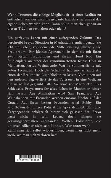 Wenn Träumen die einzige Möglichkeit ist einer Realität zu entfliehen, von der man nie geglaubt hat, dass sie einmal das eigene Leben werden kann. Dann sollte man eben genau an diesen Träumen festhalten oder nicht?Ein perfektes Leben mit einer aufregenden Zukunft. Das beschreibt Freyas Situation in Manhattan ziemlich genau. Sie lebt ein Leben, von dem jede Mitte zwanzig jährige junge Frau träumt. Ein kleines Apartment, in dem sie mit ihren zwei besten Freundinnen und ihrem Hund lebt. Ein Studienplatz an einer der renommiertesten Kunst-Unis in Manhattan. Partys. Weinabende. Warme Sommernächte mit guten Freunden. Doch das Schicksal hat eine seltsame Art einen der Realität ins Auge blicken zu lassen. Vom einen auf den anderen Tag verliert sie das Vertrauen in eine Welt, an die sie so fest geglaubt hatte. Sie wird zur Marionette ihres Schicksals. Freya muss ihr altes Leben in Manhattan hinter sich lassen. Aus Manhattan wird San Francisco. Aus Weinabenden mit Freunden werden einsame Nächte auf der Couch. Aus ihren besten Freunden wird Bobby. Ein selbstbewusster junger Polizist der Spezialeinheit, der seine Vergangenheit erfolgreich hinter sich gelassen hat. Freya passt nicht in sein Leben, doch hängen sie gezwungenermaßen aneinander. Welten kollidieren, die unterschiedlicher nicht sein könnten. Wer rettet wen?Kann man sich selbst wiederfinden, wenn man nicht mehr weiß, wo man sich verloren hat?
