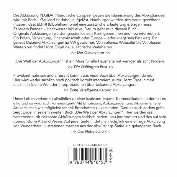 Provokant, satirisch und amüsant kommt das neue Buch über Abkürzungen daher. Hier wird weder sachlich noch politisch korrekt informiert. In "Die Welt der Abkürzungen" werden real bestehende, oft bekannte Abkürzungen ironisch seziert, neu interpretiert und das auf sehr übersichtliche Art und Weise. Auf jeder Seite findet man eine einzige Abkürzung vor. Originale Abkürzungen werden gnadenlos aufs Korn genommen.Ob Politik, Verwaltung, Finanzwirtschaft oder Europa: Jeder kriegt sein Fett weg. VW hat Horst Engel gleich ein ganzes Kapitel gewidmet. Von "vollends Wobsolet" bis "vorgaukeln - weiterfahren" findet Engel neue satirische Wahrheiten. Sehr gelungene Illustrationen zu jedem Kapitel machen aus diesem Buch eine gelungene und kurzweilige Unterhaltungslektüre.