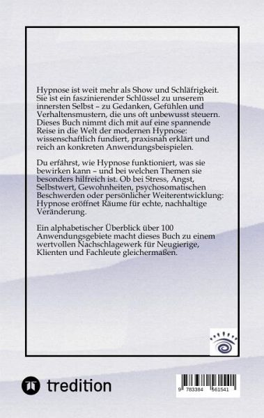 Hypnose ist kein Geheimnis, sondern ein kraftvolles Werkzeug zur Veränderung. Dieses Buch zeigt verständlich, wie Hypnose funktioniert, wann sie helfen kann - und warum unser Unterbewusstsein dabei eine zentrale Rolle spielt. Mit über 100 klar erklärten Anwendungsgebieten - von Angstbewältigung über Schlafstörungen bis hin zu Selbstvertrauen - bietet dieses Buch fundiertes Wissen, praktische Einblicke und viele Aha-Momente. Ideal für alle, die Hypnose kennenlernen oder anwenden möchten: ob als Selbsthilfe, zur Vorbereitung auf eine Hypnosesitzung oder zur fachlichen Inspiration.Lerne, dein Unterbewusstsein als Verbündeten zu nutzen - und entdecke, wie viel mehr in dir steckt.