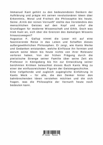 Immanuel Kant gehört zu den bedeutendsten Denkern der Aufklärung und prägte mit seinen revolutionären Ideen über Erkenntnis, Moral und Freiheit die Philosophie bis heute. Seine "Kritik der reinen Vernunft" stellte das Verständnis des menschlichen Geistes auf den Kopf und schuf die Grundlagen für moderne Wissenschaft und Ethik. Doch was trieb Kant an, sich über die Grenzen des damaligen Wissens hinauszuwagen?Augustus F. Gallup nimmt die Leser mit auf eine faszinierende Reise in das Leben und Schaffen dieses außergewöhnlichen Philosophen. Er zeigt, wie Kants Werke und Gedanken entstanden, welche Einflüsse ihn formten und warum seine Ideen bis heute nichts von ihrer Relevanz verloren haben. Von der frühen Prägung durch die pietistische Strenge seiner Familie über seine Zeit als Professor in Königsberg bis hin zur Entwicklung seiner berühmten Kritiken beleuchtet dieses Buch Kants Weg zu einer der einflussreichsten Figuren der Geistesgeschichte.Eine tiefgehende und zugleich zugängliche Einführung in Kants Werk - für alle, die den Denker hinter den bahnbrechenden Ideen verstehen möchten und die sich fragen, was die Philosophie der Vernunft heute noch bedeuten kann.