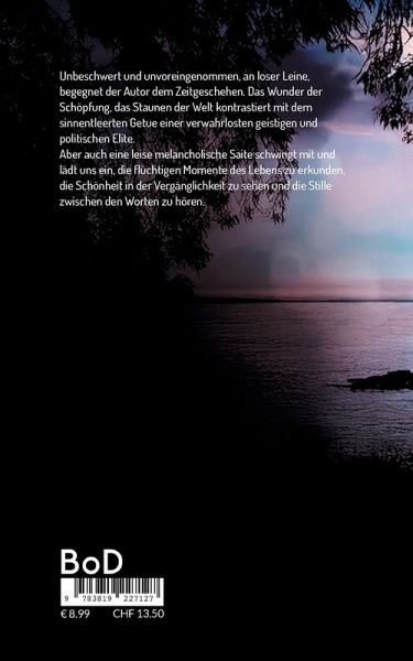 Unbeschwert und unvoreingenommen, an loser Leine, begegnet der Autor dem Zeitgeschehen. Das Wunder der Schöpfung, das Staunen der Welt kontrastiert mit dem sinnentleerten Getue einer verwahrlosten geistigen und politischen Elite. Aber auch eine leise melancholische Saite schwingt mit und lädt uns ein, die flüchtigen Momente des Lebens zu erkunden, die Schönheit in der Vergänglichkeit zu sehen und die Stille zwischen den Worten zu hören.