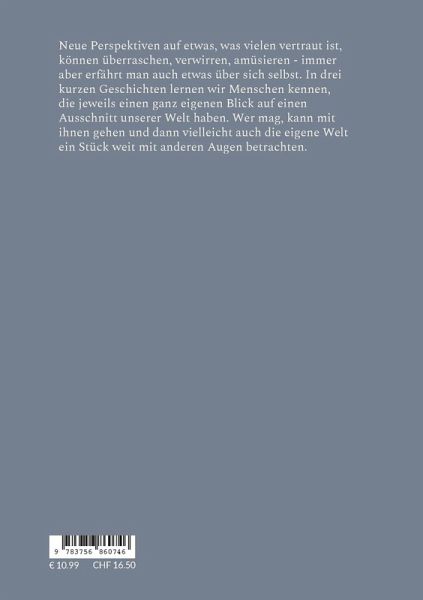 Neue Perspektiven auf etwas, was vielen vertraut ist, können überraschen, verwirren, amüsieren - immer aber erfährt man auch etwas über sich selbst. In drei kurzen Geschichten lernen wir Menschen kennen, die jeweils einen ganz eigenen Blick auf einen Ausschnitt unserer Welt haben. Wer mag, kann mit ihnen gehen und dann vielleicht auch die eigene Welt ein Stück weit mit anderen Augen betrachten.