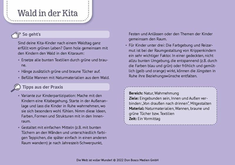 Spirituelle Werte und Naturschutz: 30 DIN-A5-Bildkarten für Kinder ab 2 Jahren Motiv zur Einstimmung auf der Vorderseite, Beschreibung und Materialeinsatz auf der Rückseite Achtsamkeitsübungen & Projektideen in 5 Themenbereiche gegliedert Von Müllvermeidung bis Upcycling: leicht umsetzbare NachhaltigkeitstippsMit pädagogischem Hintergrundwissen sowie ErklärungsansätzenFür Krippe und Kindergarten - keine Vorkenntnisse nötig