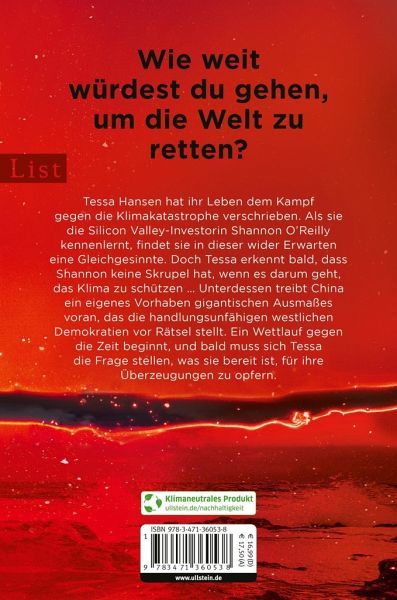 Tessa Hansen hat ihr Leben dem Kampf gegen die Klimakatastrophe verschrieben. Als sie die Silicon ValleyInvestorin Shannon O'Reilly kennenlernt, findet sie in dieser wider Erwarten eine Gleichgesinnte. Doch Tessa erkennt bald, dass Shannon keine Skrupel hat, wenn es darum geht, das Klima zu schützen ... Unterdessen treibt China ein eigenes Vorhaben gigantischen Ausmaßes voran, das die handlungsunfähigen westlichen Demokratien vor Rätsel stellt. Ein Wettlauf gegen die Zeit beginnt, und bald muss sich Tessa die Frage stellen, was sie bereit ist, für ihre Überzeugungen zu opfern.