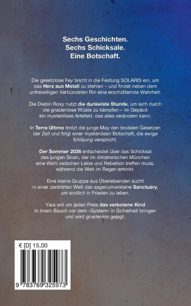 Sechs Geschichten. Sechs Schicksale. Eine Botschaft. Die gesetzlose Fey bricht in die Festung SOLARIS ein, um das Herz aus Metall zu stehlen - und findet neben dem unfreiwilligen Verbündeten Rin eine grausame Wahrheit. Die Diebin Roxy nutzt die dunkelste Stunde, um sich durch die gnadenlose Wüste zu kämpfen - im Gepäck ein mysteriöses Artefakt, das alles verändern kann. In Terra Ultimo trotzt die junge May den brutalen Gesetzen der Zeit und folgt einer mysteriösen Botschaft, die ewige Erlösung verspricht. Der Sommer 2036 entscheidet über das Schicksal des jungen Sinan, der im diktatorischen München eine Wahl zwischen Liebe und Rebellion treffen muss, während die Welt im Regen ertrinkt. Eine kleine Gruppe aus Überlebenden sucht in einer zerstörten Welt das sagenumwobene Sanctuary, um endlich in Frieden zu leben. Yara will um jeden Preis das verbotene Kind in ihrem Bauch vor dem »System« in Sicherheit bringen und wird gnadenlos gejagt.