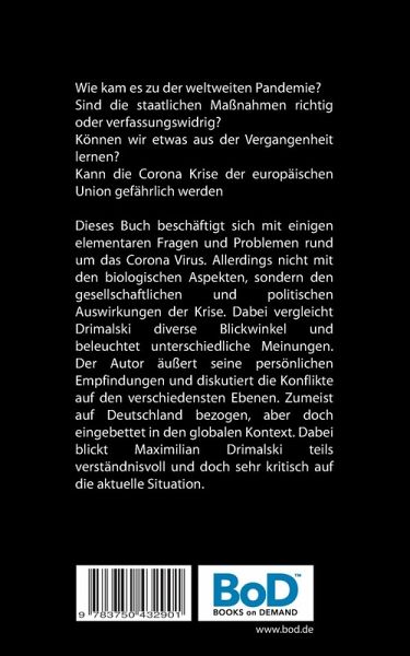 Wie kam es zu der weltweiten Pandemie?Sind die staatlichen Maßnahmen richtig oder verfassungswidrig?Können wir etwas aus der Vergangenheit lernen?Kann die Corona Krise der europäischen Union gefährlich werden?Dieses Buch beschäftigt sich mit einigen elementaren Fragen und Problemen der Corona Krise. Allerdings nicht mit den biologischen Aspekten, sondern den gesellschaftlichen und politischen Auswirkungen der Krise. Dabei vergleicht Drimalski diverse Blickwinkel und beleuchtet unterschiedliche Meinungen. Der Autor äußert seine persönliche Empfindungen und diskutiert die Konflikte auf den verschiedensten Ebenen. Zumeist auf Deutschland bezogen, aber doch eingebettet in den globalen Kontext. Dabei blickt Maximilian Drimalski teils verständnisvoll und doch sehr kritisch auf die aktuelle Situation.