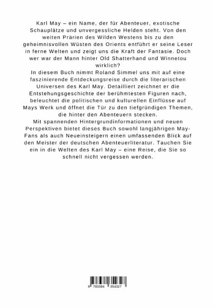 Karl May - ein Name, der für Abenteuer, exotische Schauplätze und unvergessliche Helden steht. Von den weiten Prärien des Wilden Westens bis zu den geheimnisvollen Wüsten des Orients entführt er seine Leser in ferne Welten und zeigt uns die Kraft der Fantasie. Doch wer war der Mann hinter Old Shatterhand und Winnetou wirklich?In diesem Buch nimmt Roland Simmel uns mit auf eine faszinierende Entdeckungsreise durch die literarischen Universen des Karl May. Detailliert zeichnet er die Entstehungsgeschichte der berühmtesten Figuren nach, beleuchtet die politischen und kulturellen Einflüsse auf Mays Werk und öffnet die Tür zu den tiefgründigen Themen, die hinter den Abenteuern stecken.Mit spannenden Hintergrundinformationen und neuen Perspektiven bietet dieses Buch sowohl langjährigen May-Fans als auch Neueinsteigern einen umfassenden Blick auf den Meister der deutschen Abenteuerliteratur. Tauchen Sie ein in die Welten des Karl May - eine Reise, die Sie so schnell nicht vergessen werden.
