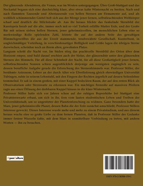 Der glänzende Abendstern, die Venus, war im Westen untergegangen. Über Groß-Stuttgart und das Neckartal begann sich eine durchsichtig klare, aber etwas kalte Winternacht zu breiten. Nach und nach flammten Tausende und Abertausende von hellen Sternen am Firmamente auf, und als weißlich schimmernder Gürtel hob sich aus der Menge jener fernen, selbstleuchtenden Weltkörper scharf und deutlich die Milchstraße ab. Aus ihr heraus blickte das funkelnde Sternbild der Kassiopeia herab auf die alte, immer noch mit so viel Torheit erfüllte Mutter Erde, und der Große Bär mit seinen sieben hellen Sternen, jener geheimnisvollen, im menschlichen Leben eine so merkwürdige Rolle spielenden Zahl, leistete ihr auf der andern Seite des gewaltigen Himmelsgewölbes die aus der Urzeit stammende, treubewährte Gesellschaft. Kunterbunt, in ungleichmäßiger Verteilung, in verschiedenartiger Helligkeit und Größe lagen die übrigen Sterne dazwischen, scheinbar noch an ihrem alten, gewohnten Platze. Langsam schritt die Nacht vor. Im Süden stieg das prachtvolle Sternbild des Orion über dem Horizont empor, und bald darauf erschien auch der Sirius, der glänzendste unter den glänzenden Sternen des Himmels. Für all diese Schönheit der Nacht, für all diese Großartigkeit jener fernen, selbstleuchtenden Sonnen schien augenblicklich derjenige am wenigsten zugänglich zu sein, dessen berufliche Aufgabe gerade die Erforschung des Sternenhimmels war. Professor Stiller, der berühmte Astronom, Lehrer an der durch Alter wie Überlieferung gleich ehrwürdigen Universität Tübingen, ruhte in seinem Lehnstuhl, mit den Fingern der Rechten ärgerlich auf dessen Seitenlehne trommelnd. Er saß in einem großen, mit einer Kuppel bedeckten Raum, der auf den ersten Blick als Observatorium oder Sternwarte zu erkennen war. Ein mächtiges Fernrohr auf massiven Pfeilern ragte aus einer Öffnung der drehbaren Kuppel hinaus in die klare Winternacht. Professor Stiller hatte sich vor Jahren schon auf der ruhigen Bopserhöhe bei Stuttgart eine Privatsternwarte erbaut, um sich in ihr, fern vom lauten studentischen Leben und Treiben der Universitätsstadt, um so ungestörter der Planetenforschung zu widmen. Ganz besonders hatte der Mars, jener geheimnisvolle Planet, dessen Bahn die der Erde zunächst umschließt, Professor Stillers Interesse geweckt. Dieses Interesse wurde mehr und mehr zu einem Privatstudium, und aus diesem heraus wuchs eine so große Liebe zu dem fernen Planeten, daß in Professor Stiller der Gedanke immer festere Wurzeln faßte, mit dem Mars in unmittelbare Verbindung zu treten, mit andern Worten ¿ ihn zu besuchen.