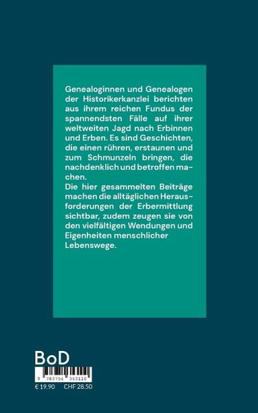 Genealoginnen und Genealogen der Historikerkanzlei - Genealogisch-Historische Recherchen berichten aus ihrem reichen Fundus der spannendsten Fälle auf ihrer weltweiten Jagd nach Erbinnen und Erben. Es sind Geschichten, die einen rühren, erstaunen und zum Schmunzeln bringen, die nachdenklich und betroffen machen.Die hier gesammelten Beiträge machen die alltäglichen Herausforderungen der Erbermittlung sichtbar, zudem zeugen sie von den vielfältigen Wendungen und Eigenheiten menschlicher Lebenswege.