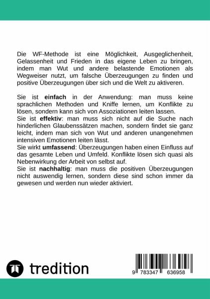 Die WF-Methode ist eine Möglichkeit, Ausgeglichenheit, Gelassenheit und Frieden in das eigene Leben zu bringen, indem man Wut und andere belastende Emotionen als Wegweiser nutzt, um falsche Überzeugungen zu finden und positive Überzeugungen über sich und die Welt zu aktiveren.Sie ist einfach in der Anwendung: man muss keine sprachlichen Methoden und Kniffe lernen, um Konflikte zu lösen, sondern kann sich von Assoziationen leiten lassen.Sie ist effektiv: man muss sich nicht auf die Suche nach hinderlichen Glaubenssätzen machen, sondern findet sie ganz leicht, indem man sich von Wut und anderen unangenehmen intensiven Emotionen leiten lässt.Sie wirkt umfassend: Überzeugungen haben einen Einfluss auf das gesamte Leben und Umfeld. Konflikte lösen sich quasi als Nebenwirkung der Arbeit von selbst auf.Sie ist nachhaltig: man muss die positiven Überzeugungen nicht auswendig lernen, sondern diese sind schon immer da gewesen und werden nun wieder aktiviert.