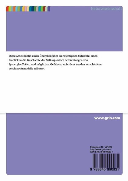 Examensarbeit aus dem Jahr 2003 im Fachbereich Chemie - Lebensmittelchemie, Note: 1,0, Universität Rostock (Fachbereich Chemie), Sprache: Deutsch, Abstract: Diese Arbeit bietet einen Überblick über die wichtigsten Süßstoffe, einen Einblick in die Geschichte der Süßungsmittel, Betrachtungen von Sysnergieeffekten und möglichen Gefahren, außerdem werden verschiedene Geschmacksmodelle erläutert.