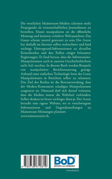 Die westlichen Mainstream-Medien scheinen mehr Propaganda als wissenschaftlichern Journalismus zu betreiben. Damit manipulieren sie die öffentliche Meinung und kreieren verkehrte Weltansichten. Das Ganze scheint zentral gesteuert zu sein. Der Autor hat deshalb im Internet selber recherchiert und fand wichtige Hintergrund-Informationen zu aktuellen Krisenherden und den Rollen einiger bekannter Regierungen. Er fand heraus, dass die Informations-Manipulationen auch in unseren Geschichtsbüchern nicht halt machen. In diesem Buch werden Beispiele von manipulativer Berichterstattung gezeigt. Anhand einer einfachen Technologie, kann der Leser lernen, Manipulationen in Berichten selber zu erkennen. Das Ziel des Buches ist die Bewusstwerdung, dass der Medien-Konsument ständigen Manipulationen ausgesetzt ist. Niemand darf sich darauf verlassen, dass die Medien immer die Wahrheit verkünden. Selber denken ist heute wichtiger denn je. Der Autor betreibt eine eigene Website, wo er verschwiegeneInformationen und Gegendarstellungen zu Mainstream-Meinungen platziert: www.eineneuezeit.ch.