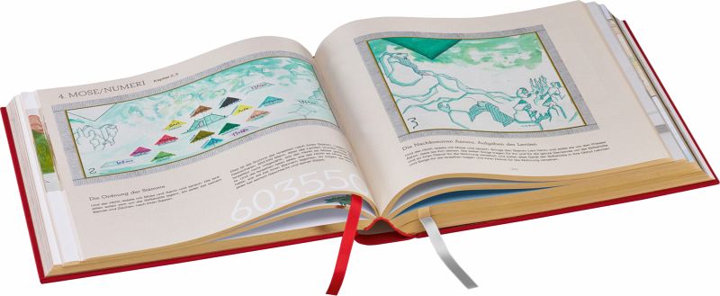 Der Stuttgarter Künstler Willy Wiedmann hinterließ ein außerordentliches Werk: In 3.333 Bildern erschuf er die einzige komplette handgemalte Darstellung des Alten und des Neuen Testaments. Im Original ist die Wiedmann Bibel ein fortlaufendes Leporello mit einer Gesamtlänge von über einem Kilometer. Das Kunstwerk erscheint nun erstmals in Buchform in drei edel ausgestatteten Editionen. Ergänzt werden die Bilder durch Kommentare des Künstlers und ausgewählte Bibelverse der neu revidierten Lutherbibel 2017.Wiedmanns Traum war es, die Bibel allen Menschen zugänglich zu machen - unabhängig davon, welche Sprache sie sprechen oder ob sie lesen können. Von 1984 bis zum Jahr 2000 arbeitete er an seinem Opus magnum im Stil der Polykonmalerei. Leider konnte Willy Wiedmann sein Werk zu Lebzeiten nicht mehr veröffentlichen; jahrelang war es auf dem Dachboden verschwunden. Erst nach seinem Tod entdeckte sein Sohn Martin Wiedmann den sagenhaften Nachlass.Die ART-Edition-Ausgabe in Rot erscheintin einer limitierten und nummerierten Auflage von 3.000 Exemplaren. Die zwei in Leinen gebundenen Bände im roten Schmuckschuber sind mit Goldprägung und Goldschnitt veredelt.Hinweis: Dieser Artikel kann nur an eine deutsche Lieferadresse ausgeliefert werden.