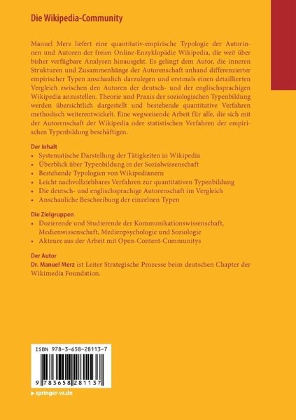 Manuel Merz liefert eine quantitativ-empirische Typologie der Autorinnen und Autoren der freien Online-Enzyklopädie Wikipedia, die weit über bisher verfügbare Analysen hinausgeht. Es gelingt dem Autor, die inneren Strukturen und Zusammenhänge der Autorenschaft anhand differenzierter empirischer Typen anschaulich darzulegen und erstmals einen detaillierten Vergleich zwischen den Autoren der deutsch- und der englischsprachigen Wikipedia anzustellen. Theorie und Praxis der soziologischen Typenbildung werden übersichtlich dargestellt und bestehende quantitative Verfahren methodisch weiterentwickelt. Eine wegweisende Arbeit für alle, die sich mit der Autorenschaft der Wikipedia oder statistischen Verfahren der empirischen Typenbildung beschäftigen.
