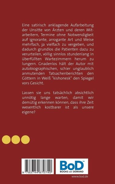 Eine satirisch anklagende Aufarbeitung der Unsitte von Ärzten und deren Mitarbeitern, Termine ohne Notwendigkeit auf ignorante, arrogante Art und Weise mehrfach, ja vielfach zu vergeben, und dadurch die Patienten dazu zu verurteilen, sinnlos stundenlang in überfüllten Wartezimmern herum zu lungern. Gnadenlos hält der Autor mit autobiographischen, schier unglaublich anmutenden Tatsachenberichten den Göttern in Weiß "kishonesk" den Spiegel vors Gesicht.Lassen sie uns tatsächlich absichtlich unnötig lange warten, damit wir demütig erkennen können, dass ihre Zeit wesentlich kostbarer ist als unsere eigene?