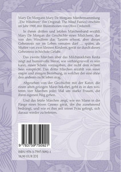 In ihrem dritten und letzten Märchenband erzählt Mary De Morgan die Geschichte eines Mädchens, das von den Windfeen das Tanzen erlernt, aber dieses Geheimnis nie im Leben verraten darf ... später als Mutter von zwei kleinen Kindern gerät sie durch dieses Geheimnis in Todesgefahr. Das zweite Märchen zeigt sehr humoristisch, wie verhängnisvoll es sein kann, einen Schein vorzugeben, der nicht zum echten Sein passt. Das dritte Märchen zeigt eine Beziehung, in welcher der eine ohne den anderen nicht leben mag. Abgesehen von der Geschichte mit der Katze, die einen alten geizigen Mann bekehrt, geht es in den weiteren vier Märchen um starke Frauen, die ihren Weg gehen. Und das letzte Märchen zeigt, wie ein Mann in die Fänge eines bösen Gnoms gerät und wie es ihm mit seiner Frau gelingt, sich daraus zu befreien.- Die Windfeen- Die eingebildete Kesta- Der Teich & der Baum- Naninas Schafe- Der Becher der Zigeunerin- Die Geschichte einer Katze- Der stumme Othmar- Die Regenmaid- Der Ackermann& der GnomDie Illustrationen in diesem Märchenband stammen von Olive Cockerell.