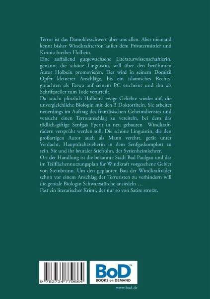 Terror ist das Damoklesschwert über uns allen. Aber niemand kennt bisher Windkraft-Terroristen. Außer dem Privatermittler und Krimischreiber Heiner Holbein. Eine auffallend gutgewachsene Literaturwissenschaftlerin, genannt die schöne Linguistin, will über den berühmten Autor Holbein promovieren. Der wird in seinem Domizil Opfer kleinerer Anschläge, bis ein islamisches Rechtsgutachten als Fatwa auf seinem PC erscheint und ihn als Schriftsteller zum Tode verurteilt. Da taucht plötzlich Holbeins ewige Geliebte wieder auf, die unvergleichliche Biologin mit den 3 Doktortiteln. Sie arbeitet neuerdings im Auftrag des französischen Geheimdienstes und versucht einen Terroranschlag zu vereiteln, bei dem das tödlich-giftige Senfgas Yperit in neu gebauten Windkrafträdern versprüht werden soll. Die schöne Linguistin, die den großartigen Autor auch als Mann verehrt, gerät unter Verdacht, Hauptdrahtzieherin in dem Senfgaskomplott zu sein. Sie und ihr brutaler Stiefsohn, der Syrienheimkehrer.Ortder Handlung ist die bekannte Stadt Bad Paulgau und das im Teilflächennutzungsplan für Windkraft vor-gesehene Gebiet von Steinbrunn. Um den geplanten Bau der Windkrafträder schon vor einem Anschlag der Terroristen zu verhindern will die geniale Biologin Schwarzstörche ansiedeln...Fast ein literarischer Krimi, der nur so von Satire strotzt.
