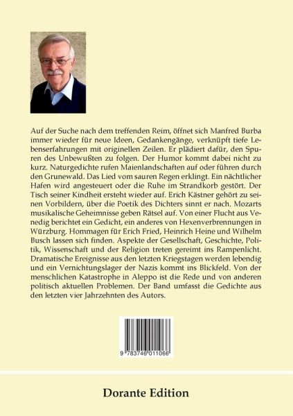 Auf der Suche nach dem treffenden Reim, öffnet sich Manfred Burba immer wieder für neue Ideen, Gedankengänge, verknüpft tiefe Lebenserfahrungen mit originellen Zeilen. Er plädiert dafür, den Spuren des Unbewussten zu folgen. Der Humor kommt dabei nicht zu kurz. Naturgedichte rufen Maienlandschaften auf oder führen durch den Grunewald. Das Lied vom sauren Regen erklingt. Ein nächtlicher Hafen wird angesteuert oder die Ruhe im Strandkorb gestört. Der Tisch seiner Kindheit ersteht wieder auf. Erich Kästner gehört zu seinen Vorbildern, über die Poetik des Dichters sinnt er nach. Mozarts musikalische Geheimnisse geben Rätsel auf. Von einer Flucht aus Venedig berichtet ein Gedicht, ein anderes von Hexenverbrennungen in Würzburg. Hommagen für Erich Fried, Heinrich Heine und Wilhelm Busch lassen sich finden. Aspekte der Gesellschaft, Geschichte, Politik, Wissenschaft und der Religion treten gereimt ins Rampenlicht. Dramatische Ereignisse aus den letzten Kriegstagen werden lebendig und ein Vernichtungslager der Nazis kommt ins Blickfeld. Von der menschlichen Katastrophe in Aleppo ist die Rede und von anderen politisch aktuellen Problemen. Der Band umfasst die Gedichte aus den letzten vier Jahrzehnten des Autors.