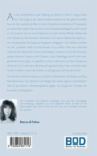 "Als die Schriftstellerin Lydia Vallberg am Bahnhof in Rom in Serge Prokenievs Taxi steigt, ist der Genfer Juwelier fasziniert von der geheimnisvollen Frau mit dem spöttischen Blick. In ihrem Hotelzimmer entdeckt er Prozessakten, aus denen hervorgeht, dass sie durch eine Schadensersatzklage finanziell ruiniert ist. Doch warum hat sie einen Kupferstich mit dem Porträt Wilhelm Müllers bei sich? Steuert sie, dem einsamen Wanderer in Schuberts Winterreise gleich, einem konsequenten Rückzug aus Resignation entgegen? Der attraktive Juwelier mit der russischen Seele ist entschlossen, ihr zu helfen. Aber was verbindet Lydia mit dem Kastell der Cantesi in den Bergen Umbriens? Auch der Filmschauspieler Salvatore Cospicco ahnt Düsteres. Lydias Seelenlage weckt in ihm unangenehme Erinnerungen, er appelliert an ihren Lebensmut und den Glauben an die Kunst. Doch Lydia kann die Enttäuschung durch ihren Vater und ihren sizilianischen Ex-Mann schwer abschütteln, sie sitzt genauso tief wie die Schuld ...Der Roman kombiniert Motive aus Schuberts Winterreise mit Zitaten von Klaus Maria Brandauer. Sein Appell an das Wagnis der neuen, eigenen Interpretation wird als produktive Lebensperspektive gegen das resignative Konzept der Romantik ins Feld geführt.Die Charaktere sind schillernd, zweideutig und auch die Unschuldigen sind keineswegs sympathisch. Es ist ein doppelter Boden, auf dem sie ihre Figuren agieren lässt und er bricht ein, wenn man es am wenigsten erwartet."Der Standard