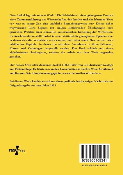 Otto Jaekel legt mit seinem Werk ``Die Wirbeltiere`` einen gelungenen Versuch einer Zusammenführung der Wissenschaften der fossilen und der lebenden Tiere vor, was zu seiner Zeit eine unübliche Betrachtungsweise war. Dieses daher wegweisende Werk beginnt mit einigen einführenden Überlegungen zum generellen Problem einer sinnvollen systematischen Einteilung der Wirbeltiere. Im Anschluss daran stellt Jaekel in einer Zeittafel die geologischen Epochen vor, in denen sich die Wirbeltiere entwickelten, und leitet somit über zu den reich bebilderten Kapiteln, in denen die einzelnen Vertebrata in ihren Stämmen, Klassen und Ordnungen vorgestellt werden. Das Buch schließt mit einem alphabetischen Sachregister, welches die Arbeit mit dem Werk angenehm gestaltet.