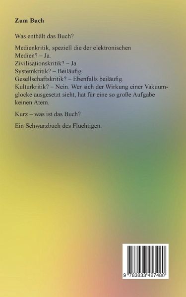 Was enthält das Buch?Medienkritik, speziell die der elektronischen Medien? - Ja.Zivilisationskritik? - Ja.Systemkritik? - Beiläufig.Gesellschaftskritik? - Ebenfalls beiläufig.Kulturkritik? - Nein. Wer sich der Wirkung einer Vakuumglocke ausgesetzt sieht, hat für eine so große Aufgabe keinen Atem.Kurz - was ist das Buch?Ein Schwarzbuch des Flüchtigen.