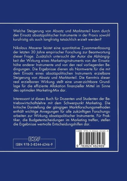 Welche Steigerung von Absatz und Marktanteil kann durch den Einsatz absatzpolitischer Instrumente tatsächlich erzielt werden? Dieses Buch gibt eine quantitative Zusammenfassung der letzten dreißig Jahre empirischer Forschung zu dieser Frage.