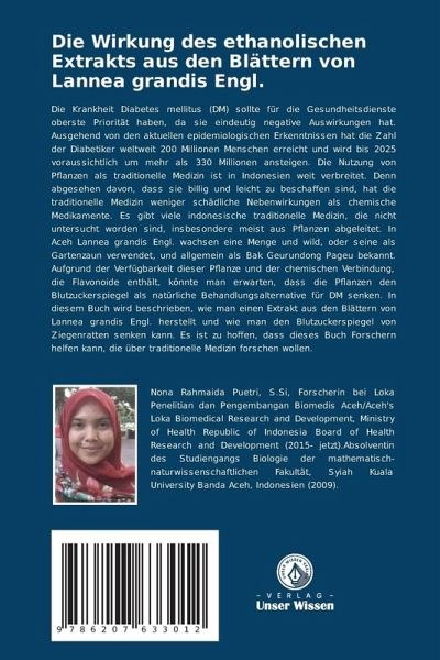 Die Krankheit Diabetes mellitus (DM) sollte für die Gesundheitsdienste oberste Priorität haben, da sie eindeutig negative Auswirkungen hat. Ausgehend von den aktuellen epidemiologischen Erkenntnissen hat die Zahl der Diabetiker weltweit 200 Millionen Menschen erreicht und wird bis 2025 voraussichtlich um mehr als 330 Millionen ansteigen. Die Nutzung von Pflanzen als traditionelle Medizin ist in Indonesien weit verbreitet. Denn abgesehen davon, dass sie billig und leicht zu beschaffen sind, hat die traditionelle Medizin weniger schädliche Nebenwirkungen als chemische Medikamente. Es gibt viele indonesische traditionelle Medizin, die nicht untersucht worden sind, insbesondere meist aus Pflanzen abgeleitet. In Aceh Lannea grandis Engl. wachsen eine Menge und wild, oder seine als Gartenzaun verwendet, und allgemein als Bak Geurundong Pageu bekannt. Aufgrund der Verfügbarkeit dieser Pflanze und der chemischen Verbindung, die Flavonoide enthält, könnte man erwarten, dass die Pflanzen den Blutzuckerspiegel als natürliche Behandlungsalternative für DM senken. In diesem Buch wird beschrieben, wie man einen Extrakt aus den Blättern von Lannea grandis Engl. herstellt und wie man den Blutzuckerspiegel von Ziegenratten senken kann. Es ist zu hoffen, dass dieses Buch Forschern helfen kann, die über traditionelle Medizin forschen wollen.
