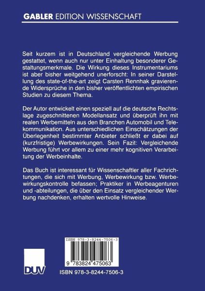 Der Autor entwickelt einen auf die deutsche Rechtslage zugeschnittenen Modellansatz und überprüft ihn mit Werbemitteln aus den Branchen Automobil und Telekommunikation. Sein Fazit: Vergleichende Werbung führt zu einer mehr kognitiven Verarbeitung der Werbeinhalte.