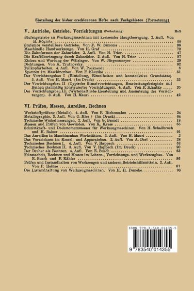 I. Die Stellung der Einspindelautomaten.- 1. Allgemeines.- 2. Werkzeugmaschinen für Drehbearbeitung.- 3. Vergleichsaufstellung.- II. Die Bauarten der Einspindelautomaten.- 4. Einteilung.- 5. Einspindel-Form- und -Schraubenautomaten.- 6. Einspindel-Langdrehautomaten.- 7. Einspindel-Vielstahlautomaten.- 8. Einspindel-Revolverautomaten.- III. Bearbeitungsmöglichkeiten auf Einspindelautomaten.- 9. Form- und Schraubenautomaten.- 10. Langdrehautomaten.- 11. Vielstahlautomaten.- 12. Revolverautomaten.- IV. Maschinenauswahl.- 13. Berücksichtigung der Werkstücke.- 14. Wirtschaftlichkeit von Sondereinrichtungen.- V. Das Einstellen der Automaten.- 15. Werkzeug- und Einstellpläne.- 16. Winke für den Werkzeugeinsatz.- 17. Spanneinrichtungen.- 18. Einstellung der Schlittenwege.- 19. Durchführung der Einstellung.- VI. Arbeitsbeispiele und Leistungsberechnung.- 20. Form- und Schraubenautomaten.- 21. Langdrehautomaten.- 22. Vielstahlautomaten.- 23. Revolverautomaten.- VII. Erzielung und Erhaltung der Genauigkeit.- 24. Herstellungsgenauigkeit der Maschinen.- 25. Genauigkeit der Werkzeuge und Einstellung.