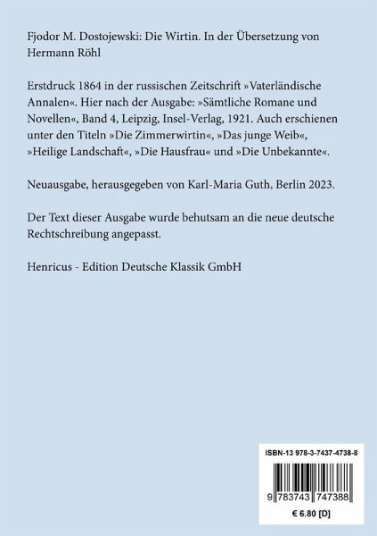 Fjodor M. Dostojewski: Die Wirtin. In der Übersetzung von Hermann RöhlErstdruck 1864 in der russischen Zeitschrift »Vaterländische Annalen«. Hier nach der Ausgabe: »Sämtliche Romane und Novellen«, Band 4, Leipzig, Insel-Verlag, 1921. Auch erschienen unter den Titeln »Die Zimmerwirtin«, »Das junge Weib«, »Heilige Landschaft«, »Die Hausfrau« und »Die Unbekannte«.Neuausgabe, herausgegeben von Karl-Maria Guth, Berlin 2023.Der Text dieser Ausgabe wurde behutsam an die neue deutsche Rechtschreibung angepasst.Umschlagabbildung: Konstantin Makovsky (1839-1915), Russische SchönheitGesetzt aus der Minion Pro, 11 pt.Die Sammlung Hofenberg erscheint im Verlag Henricus - Edition Deutsche Klassik GmbH, BerlinÜber den Autor:1821 in Moskau als zweites von acht Kindern eines Arztes geboren besucht Fjodor Michailowitsch Dostojewski die angesehene militärische ingenieurtechnische Universität in St. Petersburg, die er als Leutnant abschließt und 1843 seinen Dienst als Militäringenieur antritt. Ein gutes Jahr später bereits quittiert er den Dienst, um mehr Zeit zum Schreiben zu haben. 1849 wird der Frühsozialist als Anhänger des Petraschewski-Zirkels verhaftet, zum Tode verurteilt und schließlich zu Haft und Militärdienst in Sibirien begnadigt. 1859 entlassen wendet er sich von seinen revolutionären Ideen ab und stellt die menschliche Seele ins Zentrum seiner wiederaufgenommenen schriftstellerischen Tätigkeit. Er gründet zwei Zeitschriften, die eine wird verboten, die andere geht pleite und er flieht für Jahre ins Ausland vor seinen Gläubigern. Er leidet an Epilepsie und verfällt zeitweise der Spielsucht. Am 9. November 1881 stirbt mit Fjodor Dostojewski ein großer Meister der psychologischen Betrachtung der menschlichen Seele und einer der bedeutendsten russischen Schriftsteller überhaupt.