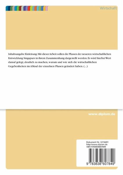 Mit dieser Arbeit sollen die Phasen der neueren wirtschaftlichen Entwicklung Singapurs in ihrem Zusammenhang dargestellt werden. Es wird hierbei Wert darauf gelegt, deutlich zu machen, warum und wie sich die wirtschaftlichen Gegebenheiten im Ablauf der einzelnen Phasen geändert haben.